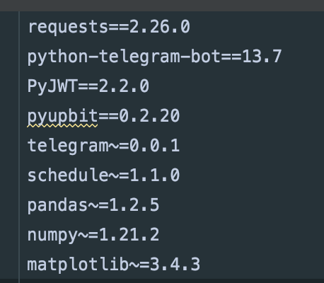 저희 코드에는 텔레그램, 업비트, pandas 등 모듈을 사용해야 하기 때문에 버전 정보들을 기입해두었다고 보면 됩니다.