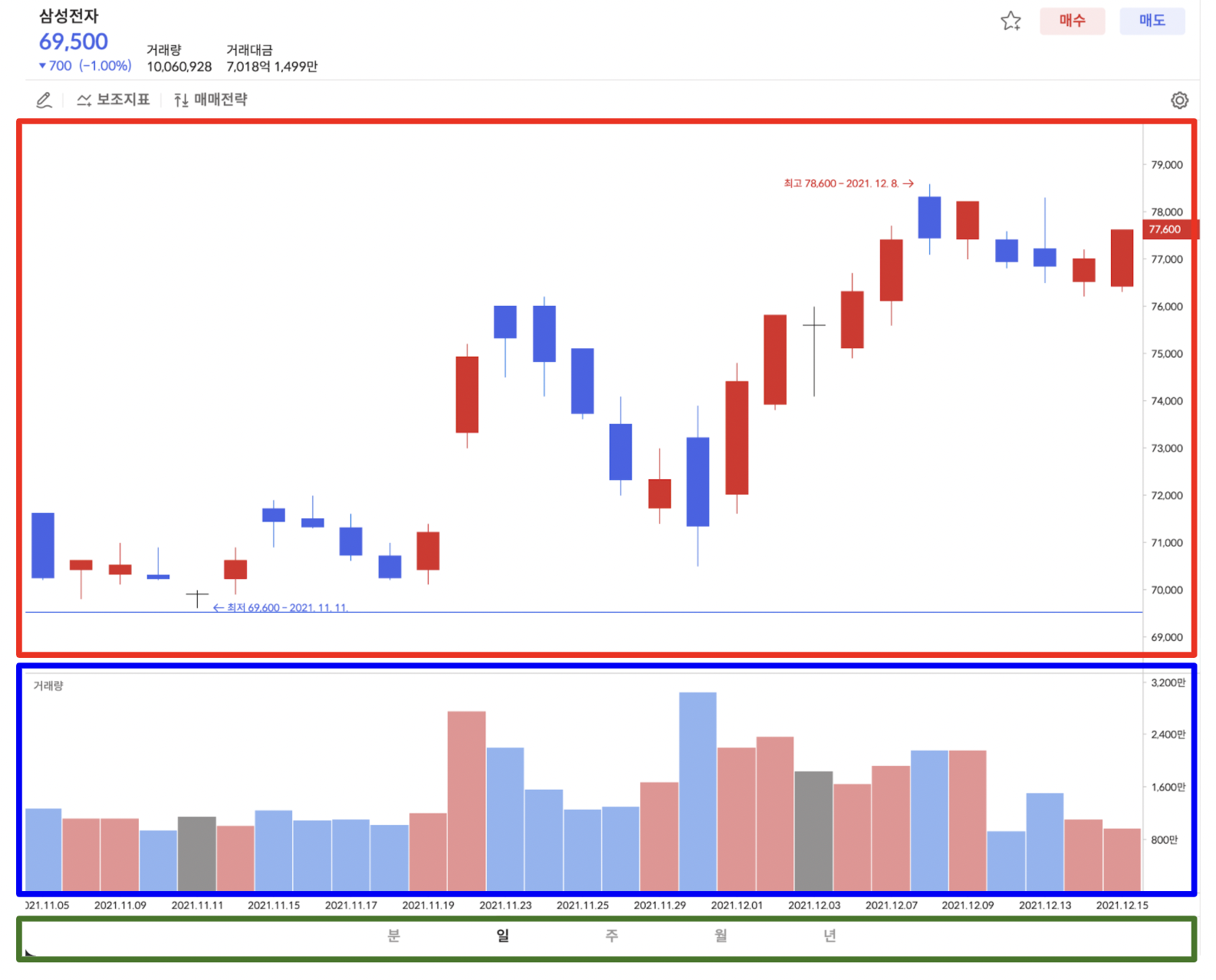 하지만 저희는 좀 더 나아가야겠죠? 차트의 구성과 형태에 대해서 알아보았는데 그럼 아까 분, 일, 주, 월, 년 단위의 차트를 선택하여 볼 수 있다고 하지 않았었나요? 네 여러분은 이미 답을 아셨을 것 같지만 그래도 다시 말해보자면 캔들 봉 1개에 해당하는 기간이라고 생각하시면 되겠습니다. 일봉일 경우에는 1개의 캔들이 1일에 해당하는 내용을 담고 있다는 것입니다. 위에서 설명한 바와 같이 장 시작, 장 마감 그리고 그 시간 사이의 최고점과 최저점이 변동되면서 일봉 1개의 캔들을 만들어 내는 것입니다. 그럼 당연한 소리겠지만 주, 월등은 봉 1개에 1주, 1개월의 봉이겠죠? 분봉은 역시 1분 봉, 3분 봉, 5분 봉등 시간대에 해당하는 봉들을 말하는 것일 겁니다. 그러면 여기서 이러한 봉들을 만들어내는 지표는 무엇일까요?