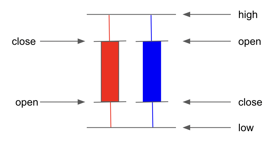 캔들의 가장 상단의 부분을 high(고가)라고 하고 반대로 가장 하단의 부분을 low(저가)라고 합니다. 그리고 캔들의 중간에 두꺼운 영역은 양봉과 음봉이 약간 다른데 양봉에서는 하단이 open(시가) 상단이 close(종가)라고 하고 음봉에서는 반대 입니다.