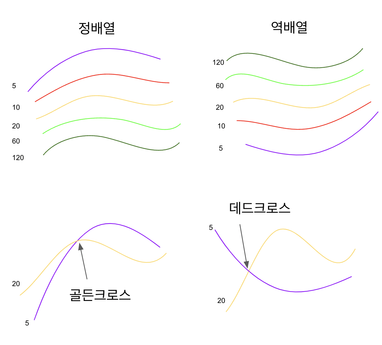 이러한 기준들에 따라서 기법들이 다양하게 존재합니다. 다들 들어보셨을 것 같긴 하지만 조금 나열을 해보자면... 정배열, 역배열, 골든크로스, 데드크로스 등이 있습니다. 정배열이란 각각의 이동평균선이 5, 10, 20, 60, 120선이 순서대로 나란히 정렬된 상태의 이동평균선 형태를 말하는 것입니다. 역배열은 그 반대죠. 120, 60, 20, 10, 5 이러한 형태로 정렬되어있다면 역배열이라고 합니다.