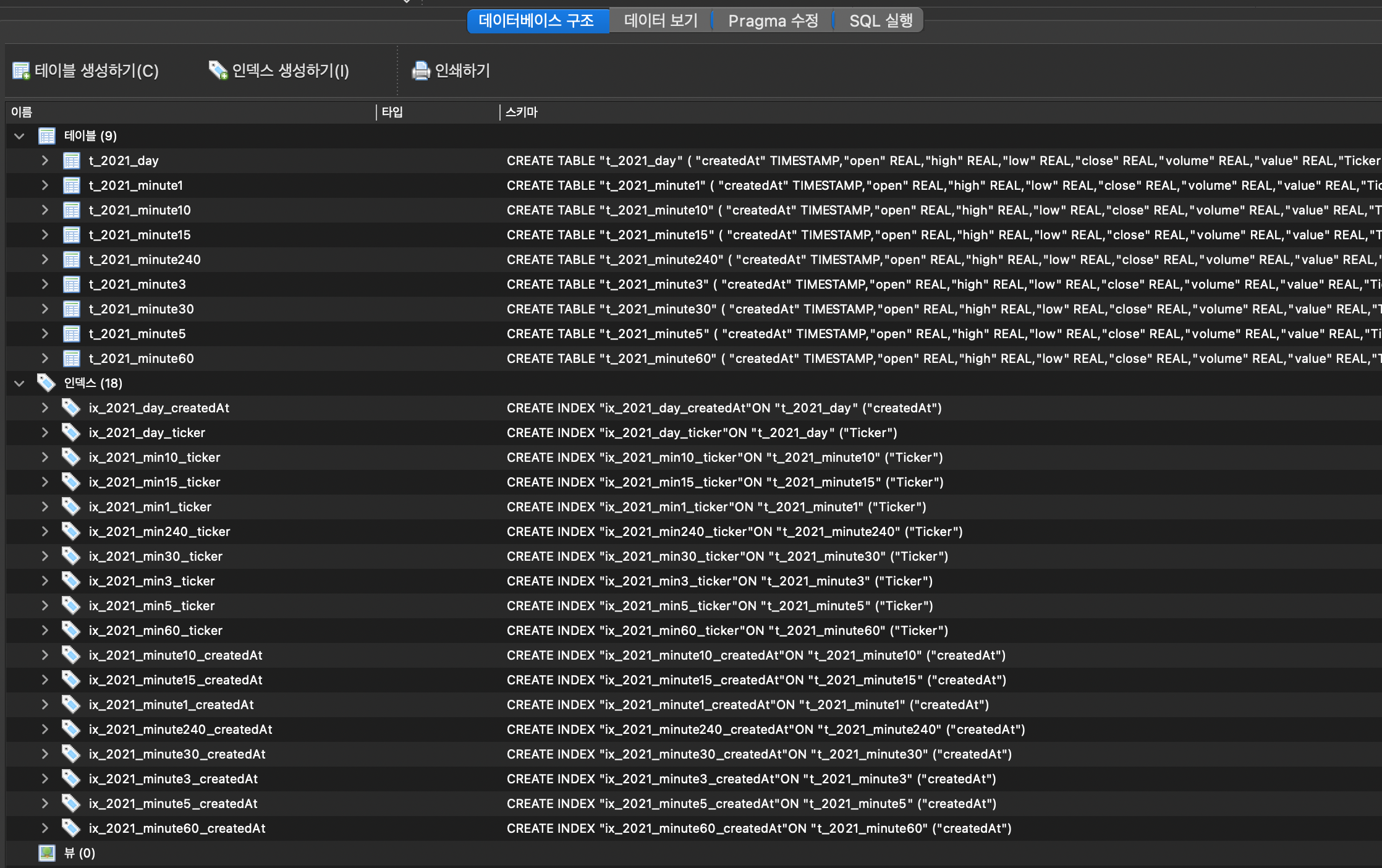 그림과 같이 DB에 각 분봉 별로 모든 데이터를 DB에 저장하였습니다. 전부 저장하는데 약 3일 정도... 걸린 것 같습니다. 분의 주기가 적을수록 데이터양이 많기 때문에 1, 3, 5분 봉은 데이터양이 엄청 많습니다 ㅎㅎ 하지만 생각보다 데이터 용량은 다행히 적당했습니다. 총 10.39GB가 나오네요 ( 위 그림 보시면 인덱스 설정까지 했을 때의 용량입니다. )