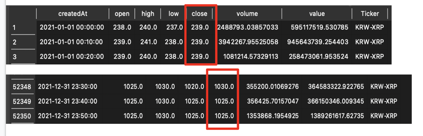 우선 업비트 기준으로 2021년도 XRP의 OHLCV데이터를 한번 들여다보았습니다. 10분 봉이였습니다.