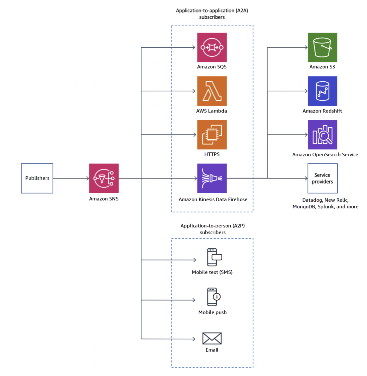 Amazon Simple Notification Service(Amazon SNS)는 게시자에서 구독자(생산자 및 소비자라고도 함)로 메시지를 전송하는 관리형 서비스입니다. 게시자는 논리적 액세스 지점 및 커뮤니케이션 채널인 주제에 메시지를 전송하여 구독자와 비동기식으로 통신합니다. 클라이언트는 SNS 주제를 구독하고 와 같이 지원되는 엔드포인트 유형을 사용하여 게시된 메시지를 수신할 수 있습니다.