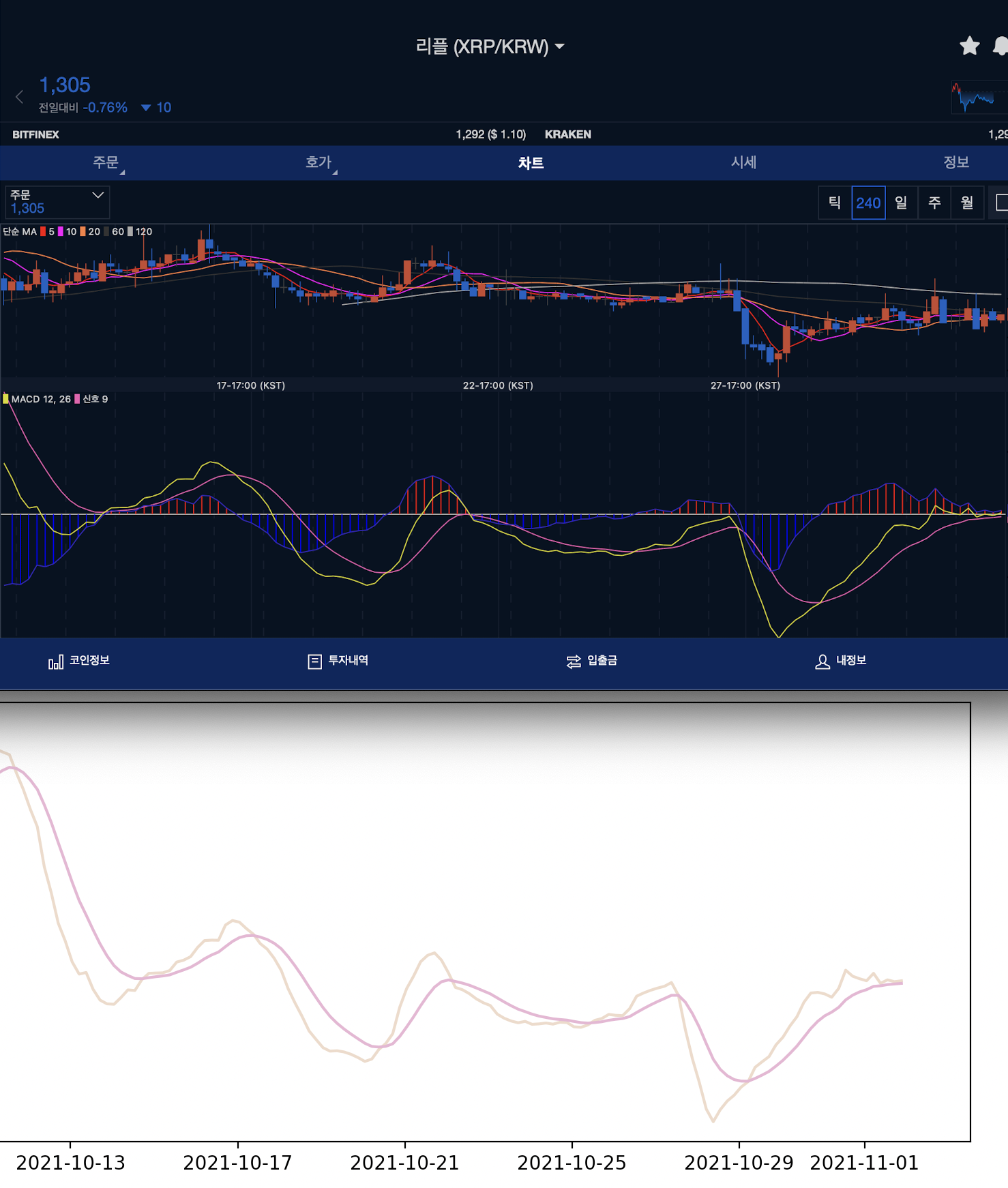 대략적으로 곡선의 흐름과 교차점이 업비트 차트와 비교하니 동일한 형태로 그려지는 것을 확인할 수 있습니다.