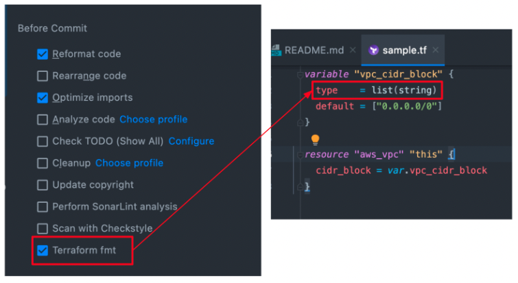 Before Commit에 플러그인 설치로 인하여 Terraform fmt 기능이 추가 되어서 체크해보았더니 type 부분에 정의한 list란 문자열이 list(string) 으로 자동 변환이 되었다. 해당기능은 다음과 같이 동작한다.